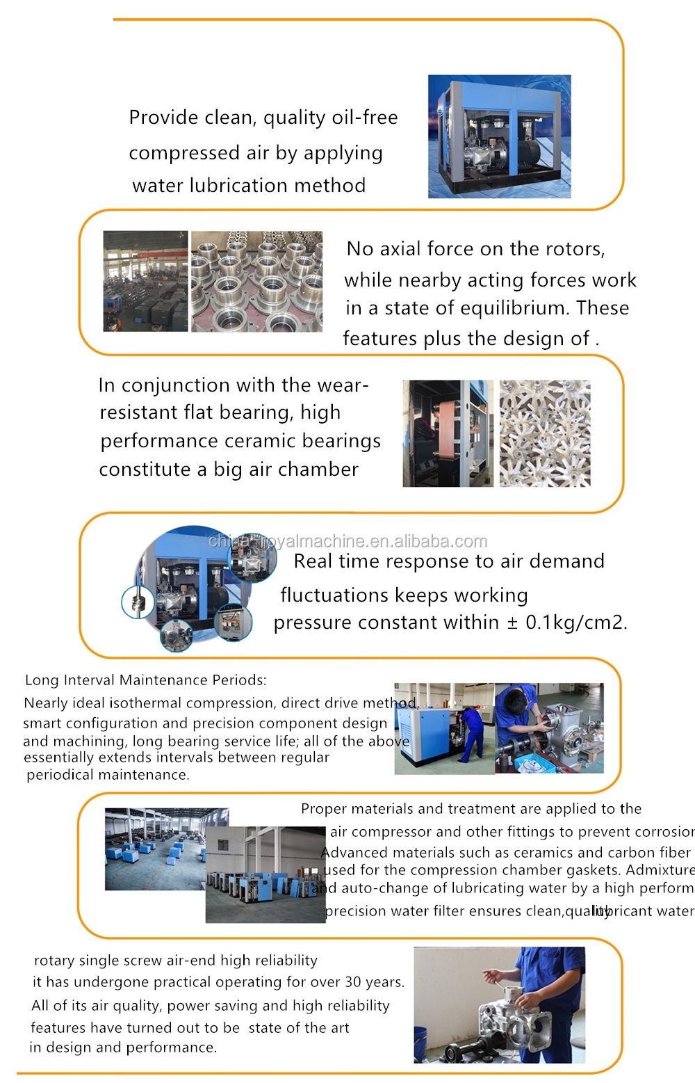 Nearly ideal isothermal compression, direct driven method, smart configuration and precision component design and machining, long bearing service life, all of the above essentially extends interval between regular periodical maintenance.